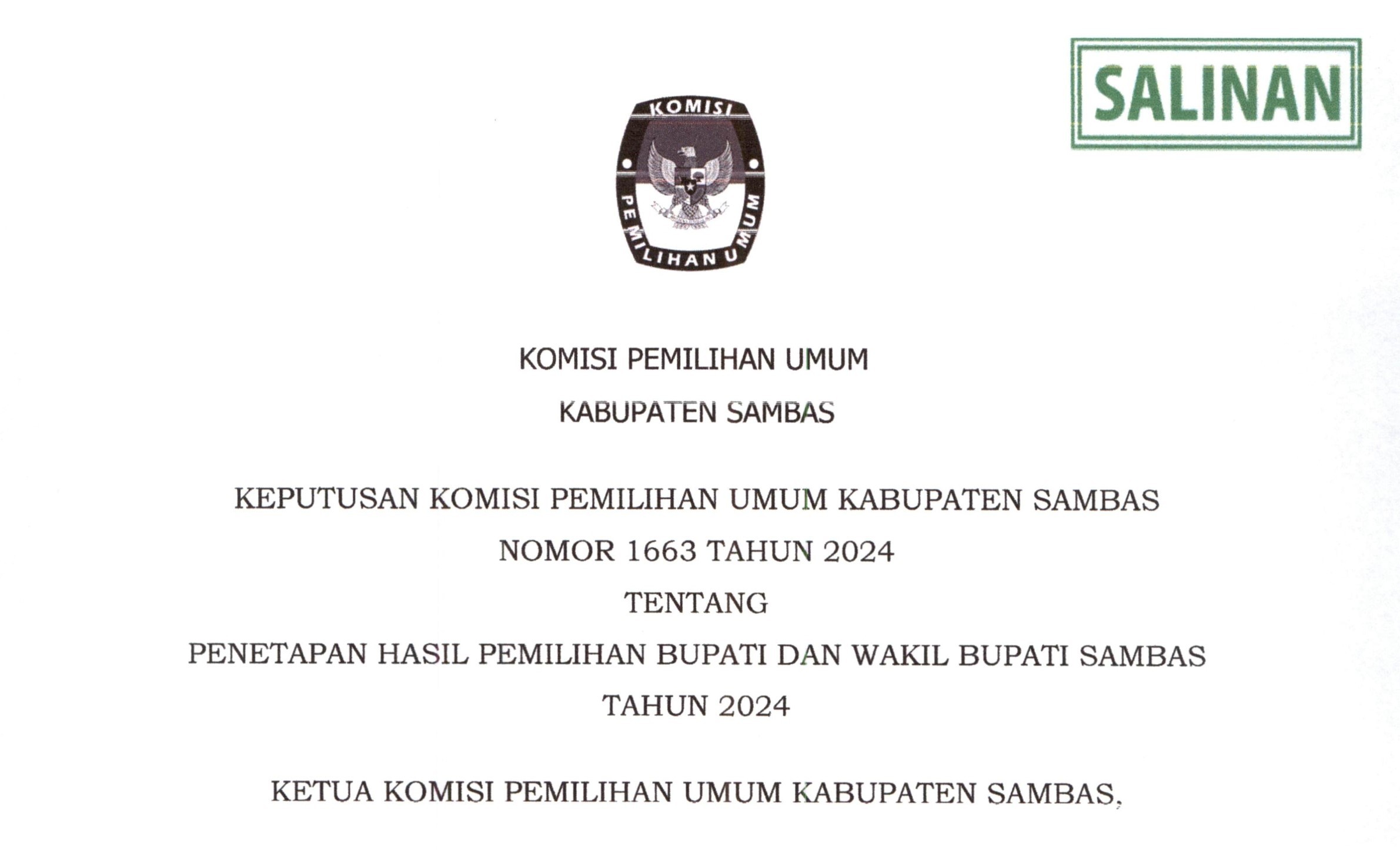 Berikut kami sampaikan PENGUMUMAN PENETAPAN HASIL PEMILIHAN BUPATI DAN WAKIL BUPATI SAMBAS 2024