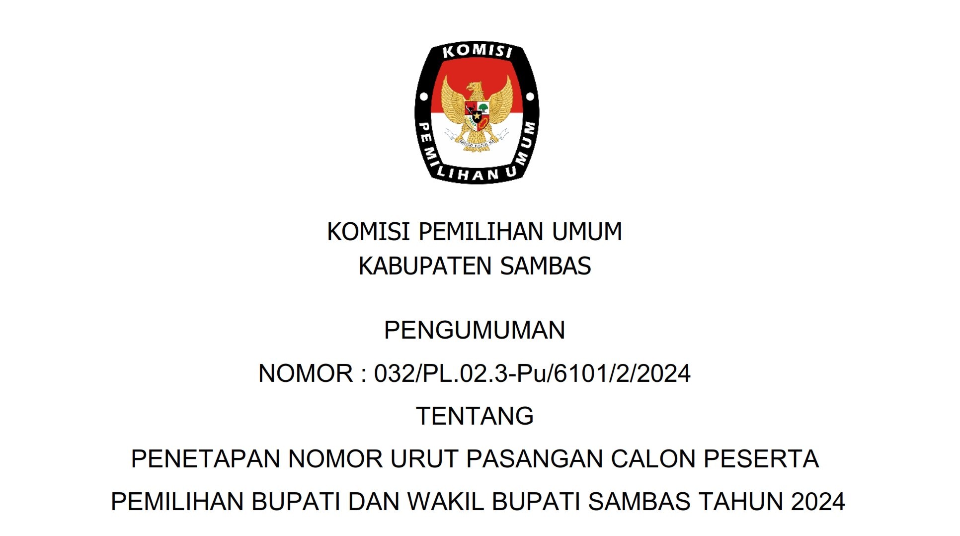 PENGUMUMAN PENETAPAN NOMOR URUT PASANGAN CALON PESERTA PEMILIHAN BUPATI DAN WAKIL BUPATI SAMBAS TAHUN 2024