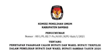 Pengumuman Penetapan Pasangan Calon Bupati Dan Wakil Bupati Terpilih Dalam Pemilihan Bupati Dan Wakil Bupati Sambas Tahun 2020 Jumat, 22 Januari 2021 00:00 373 LIHAT PENGUMUMAN Bagikan: Dilihat 373 Kali.