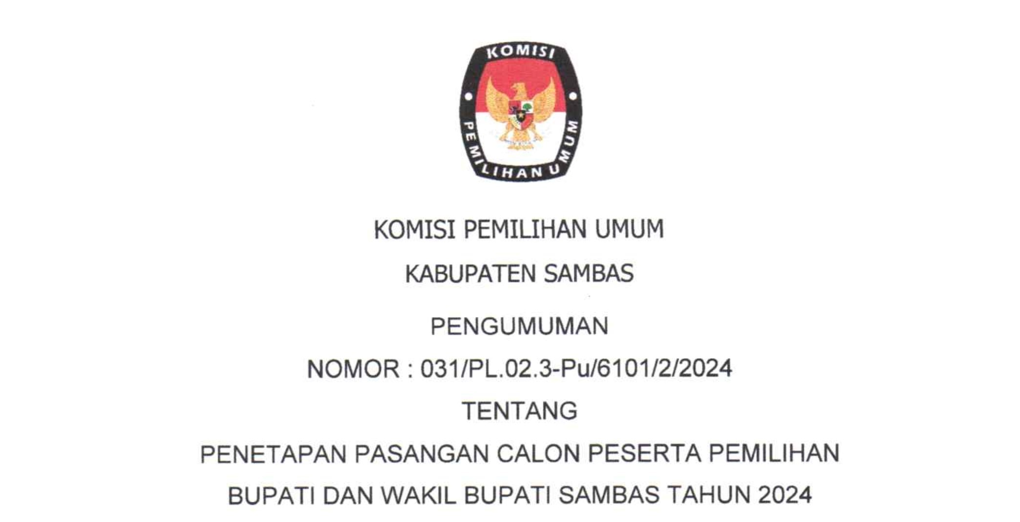 Berikut kami sampaikan PENGUMUMAN PENETAPAN PASANGAN CALON PESERTA PEMILIHAN BUPATI DAN WAKIL BUPATI SAMBAS TAHUN 2024