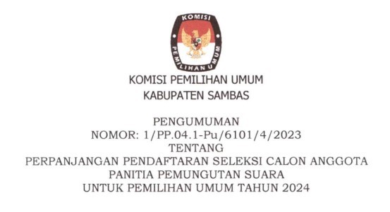 Pengumuman Perpanjangan Kedua Pendaftaran Seleksi Calon Anggota Panitia Pemungutan Suara Untuk Pemilihan Umum Tahun 2024 Selasa, 03 Januari 2023 00:00 466 DOWNLOAD PENGUMUMAN Bagikan: Dilihat 466 Kali.