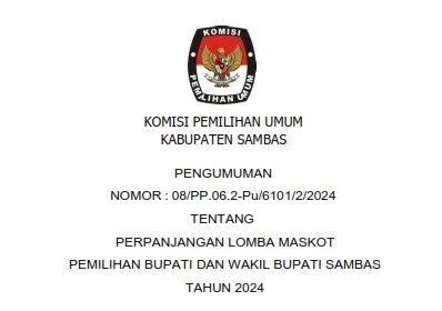 Sehubungan dengan diadakan Lomba Maskot Pemilihan Bupati dan Wakil Bupati Sambas Tahun 2024 yang diselenggarakan oleh Komisi Pemilihan Umum Kabupaten Sambas yang sebelumnya sudah diumumkan sejak tanggal 23 April 2024 dan dengan Batas Pengiriman Karya Lomba Maskot paling lambat tanggal 3 Mei 2024. Berdasarkan hasil keputusan rapat dewan juri dengan ini dilakukan Perpanjangan Pendaftaran Lomba Maskot dan Batas Pengiriman Karya paling lambat pada tanggal 8 Mei 2024. Bagi peserta yang telah mengirimkan karyanya, dapat memperbaiki dan mengirimkan ulang melalui email panitia. Sehubungan dengan diadakan Lomba Maskot Pemilihan Bupati dan Wakil Bupati Sambas Tahun 2024 yang diselenggarakan oleh Komisi Pemilihan Umum Kabupaten Sambas yang sebelumnya sudah diumumkan sejak tanggal 23 April 2024 dan dengan Batas Pengiriman Karya Lomba Maskot paling lambat tanggal 3 Mei 2024. Berdasarkan hasil keputusan rapat dewan juri dengan ini dilakukan Perpanjangan Pendaftaran Lomba Maskot dan Batas Pengiriman Karya paling lambat pada tanggal 8 Mei 2024. Bagi peserta yang telah mengirimkan karyanya, dapat memperbaiki dan mengirimkan ulang melalui email panitia.