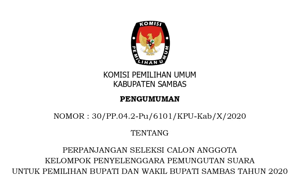 Pengumuman Perpanjangan Seleksi Calon Anggota KPPS Untuk Pemilihan Bupati Dan Wakil Bupati Sambas Tahun 2020 Rabu, 14 Oktober 2020 00:00 359 LIHAT PENGUMUMAN Bagikan: Dilihat 359 Kali.