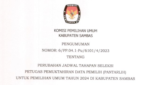Pengumuman Perubahan Jadwal Tahapan Seleksi Petugas Pemutakhiran Data Pemilih untuk Pemilu Tahun 2024 Minggu, 05 Februari 2023 23:00 697 DOWNLOAD PENGUMUMAN Bagikan: Dilihat 697 Kali.