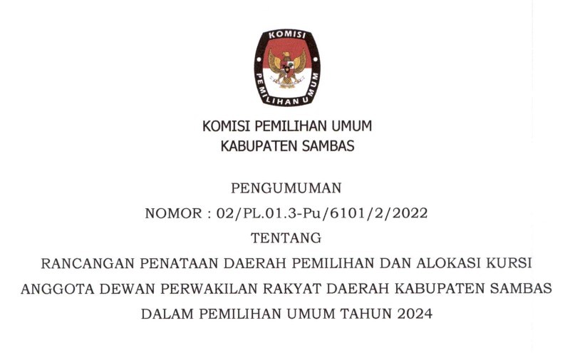 Pengumuman Rancangan Penataan Daerah Pemilihan dan Alokasi Kursi Anggota DPRD Kabupaten Sambas dalam Pemilu 2024