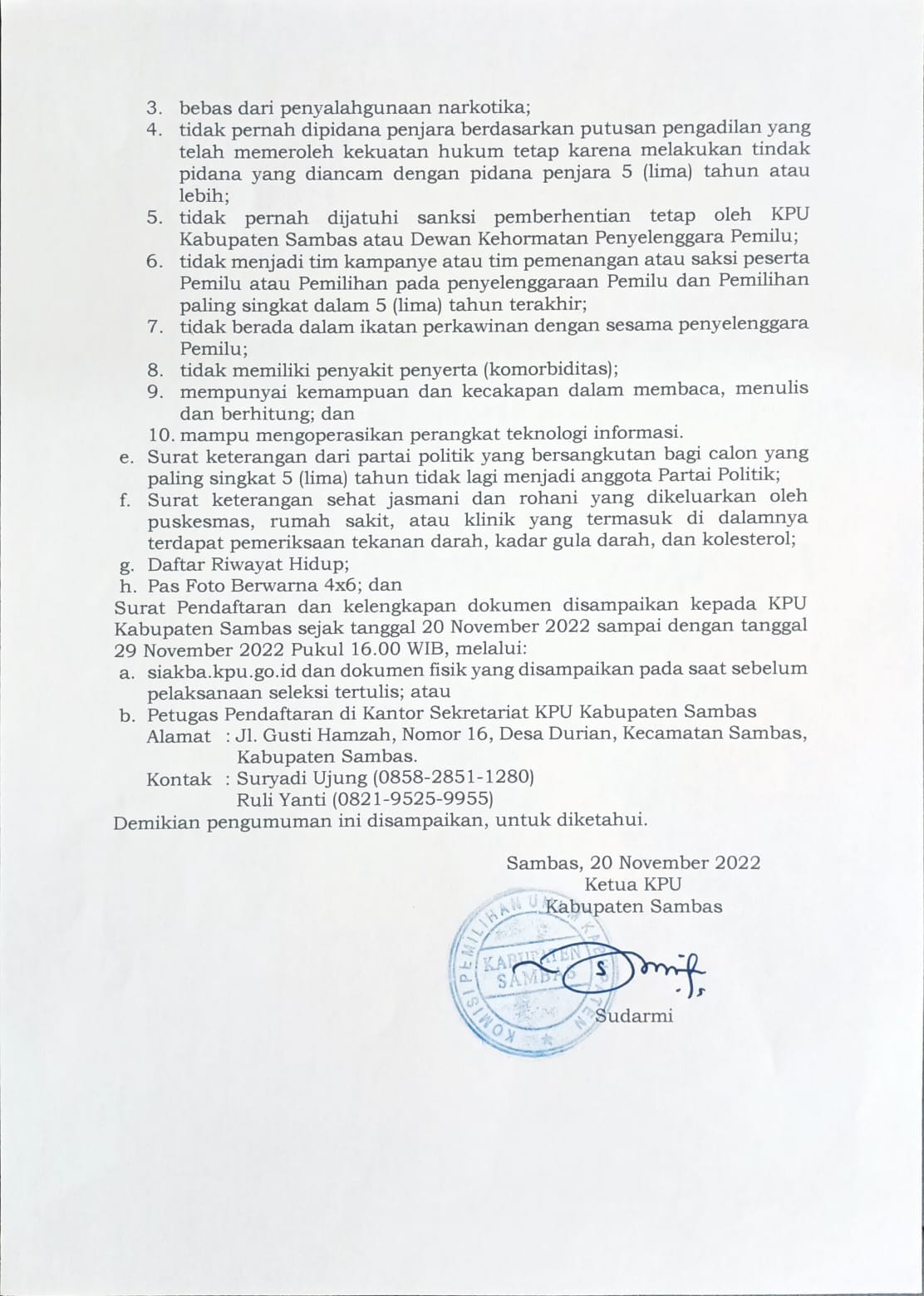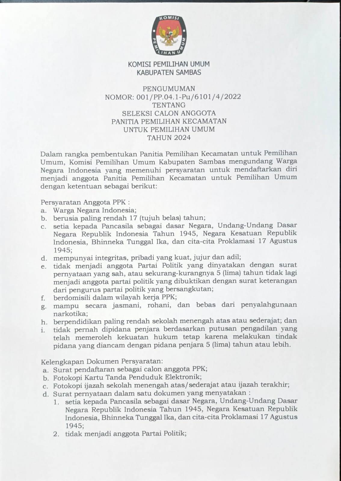 Pengumuman Seleksi Calon Anggota Panitia Pemilihan Kecamatan untuk Pemilihan Umum Tahun 2024 Minggu, 20 November 2022 00:00 729 Surat Pendaftaran, Surat Pernyataan dan Daftar Riwayat Hidup Otomatis Terisi dan Bisa di Download pada SIAKBA Link SIAKBA Download PDF Pengumuman Download PDF Surat Pendaftaran, Surat Pernyataan dan Daftar Riwayat Hidup di SIAKBA Bagikan: Dilihat 729 Kali.