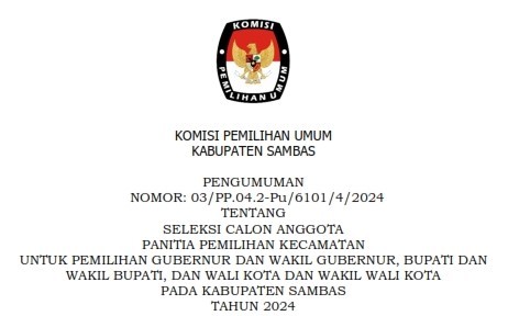 PENGUMUMAN SELEKSI CALON ANGGOTA PPK UNTUK PEMILIHAN GUBERNUR DAN WAKIL GUBERNUR, BUPATI DAN WAKIL BUPATI, DAN WALI KOTA DAN WAKIL WALI KOTA PADA KABUPATEN SAMBAS TAHUN 2024