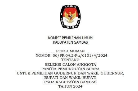 Dalam rangka pembentukan Calon Anggota Panitia Pemungutan Suara untuk Pemilihan Gubernur dan Wakil Gubernur, Bupati dan Wakil Bupati, Tahun 2024, Komisi Pemilihan Umum Kabupaten Sambas mengundang Warga Negara Indonesia yang memenuhi kualifikasi untuk mendaftarkan diri menjadi Panitia Pemungutan Suara untuk Pemilihan Gubernur dan Wakil Gubernur, Bupati dan Wakil Bupati.