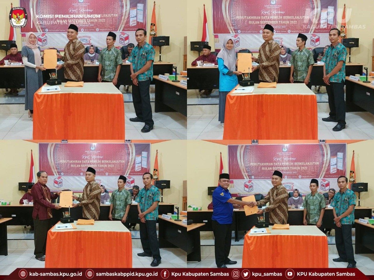 Sebelum kegiatan berakhir, diserahkan Berita Acara Hasil Rapat Koordinasi Pemutakhiran Daftar Pemilih Berkelanjutan Tahun 2022 Periode September 2022 beserta Rekapitulasi Daftar Pemilih Hasil PDPB Bulan September Tahun 2022 kepada para peserta rapat. (humas kpu kab.sambas)