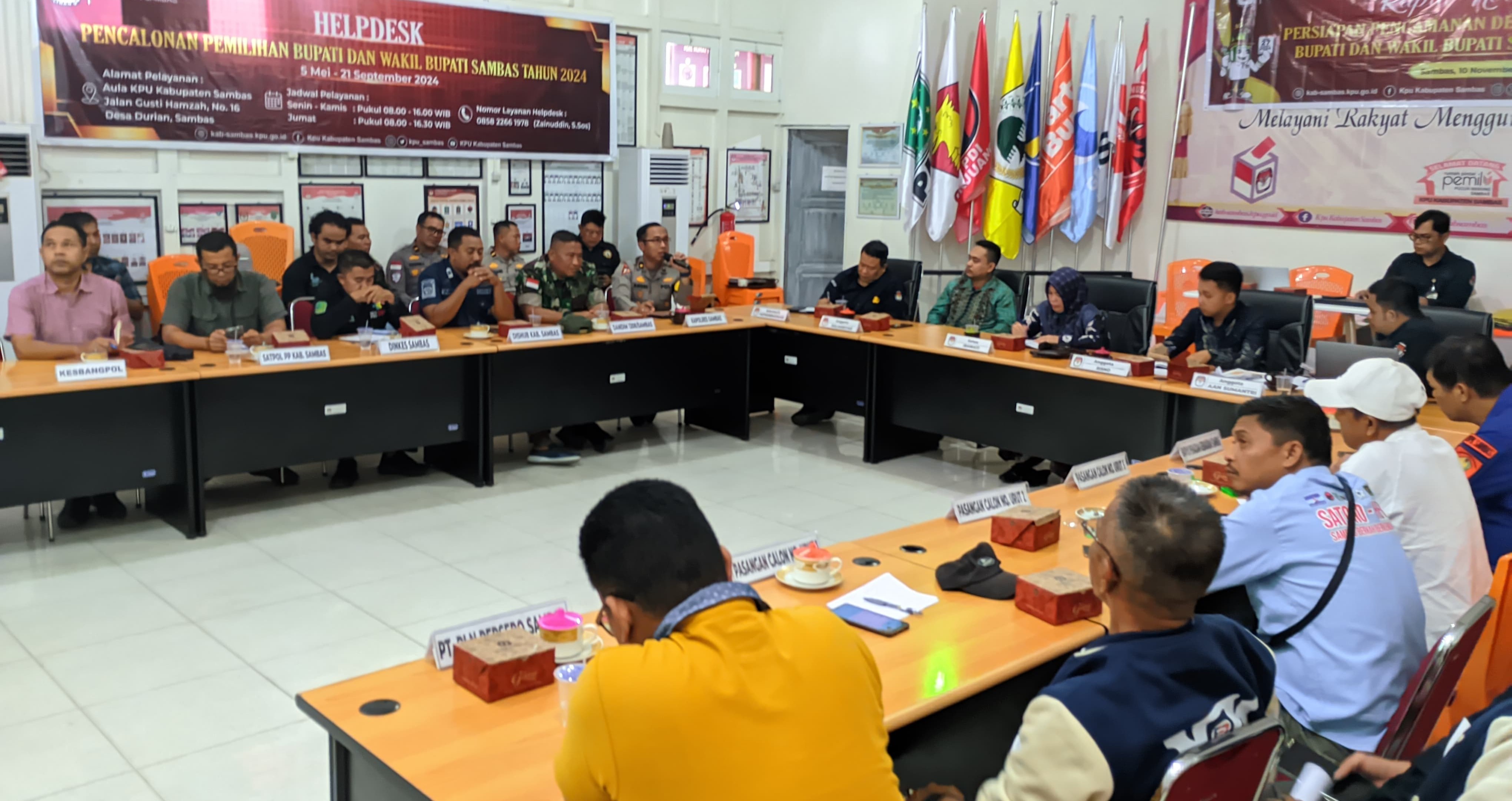 Komisi Pemilihan Umum Kabupaten Sambas, Minggu (10/11), bertempat di Aula Kantor KPU Kabupaten Sambas melaksanakan rapat koordinasi dengan sejumlah stakeholder. Kegiatan yang dipimpin langsung oleh Ketua KPU Kabupaten Sambas Irawati dan anggota dihadiri oleh Kabag Ops Polres Sambas, perwakilan Kodim 1208, perwakilan Dishub Kabupaten Sambas, Kasat Pol PP Sambas, dan lain-lain.