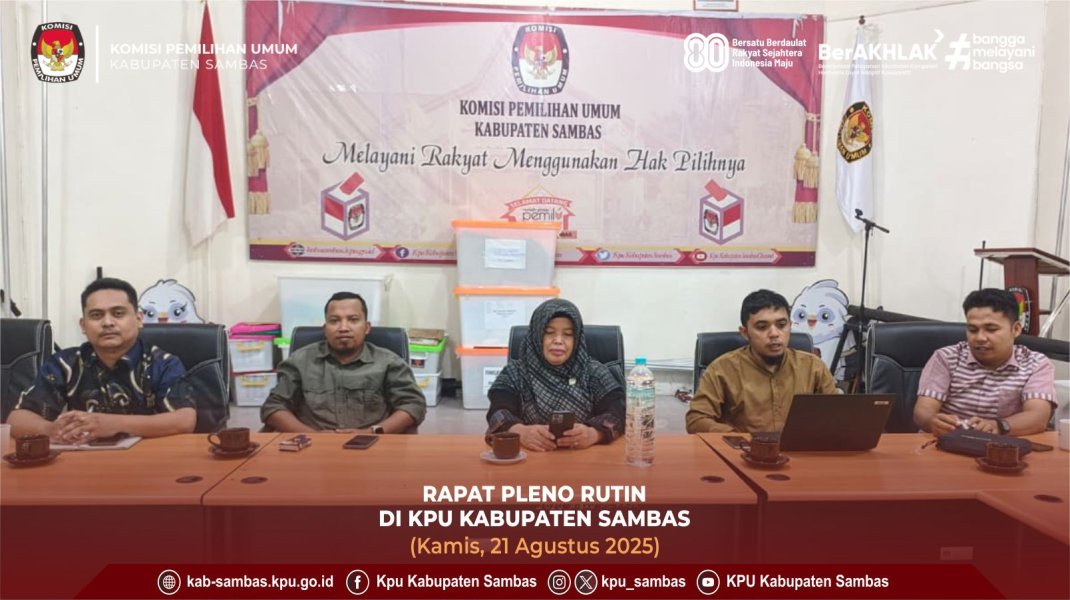 sambas.kpu.go.id - Sambas, KPU Kabupaten Sambas Melaksanakan Rapat Pleno Rutin di Ruang Rapat Kantor KPU Kabupaten Sambas, Kamis (21/8/2025). Rapat Dihadiri Oleh Ketua dan Anggota, Sekretaris, Kasubbag dan Staf Sekretariat KPU Kabupaten Sambas.Agenda rapat yaitu membahas Evaluasi Kegiatan 1 Minggu Sebelumnya, Rencana Kegiatan 1 Minggu Kedepan, Pembahasan Naskah Kajian Teknis Pemilu dan Pemilihan Tahun 2024 dan Hal-hal lain yang dianggap perlu.