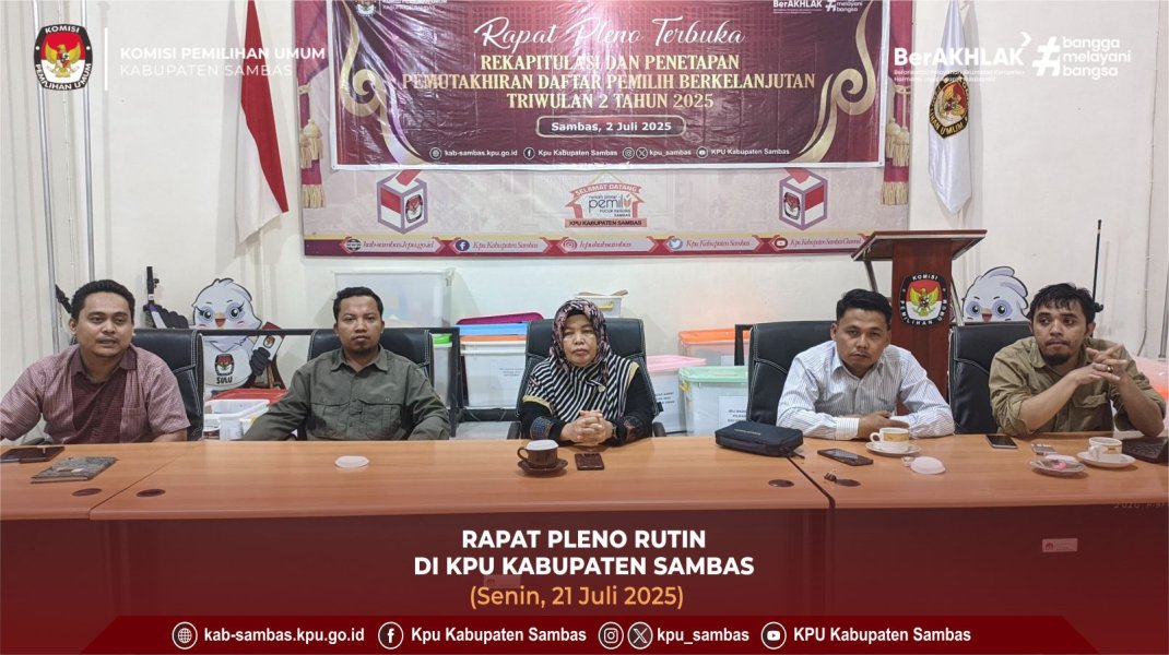 sambas.kpu.go.id - Sambas, KPU Kabupaten Sambas melaksanakan Rapat Pleno Rutin di ruang rapat kantor KPU Kabupaten Sambas, Senin (21/7/2025). Rapat dipimpin oleh Ketua dan dihadiri Anggota, Sekretaris, Kasubbag dan Staf Sekretariat KPU Kabupaten Sambas. Agenda rapat yaitu membahas Evaluasi Kegiatan 1 Minggu Sebelumnya, Rencana Kegiatan 1 Minggu Kedepan, Tindak-lanjut Hasil Rapat Koordinasi Pelaksanaan Kegiatan Pasca Pemilu dan Pemilihan tanggal 18 Juli 2025 terkait Surat Dinas KPU RI Nomor 1109/PL.01-SD/06/2025 Tentang Penjelasan Pelaksanaan Kegiatan Pasca Pemilu dan Pemilihan, Tindak-lanjut Rapat Koordinasi SPIP Bersama KPU Republik Indonesia dan Hal-hal lain yang dianggap perlu.
