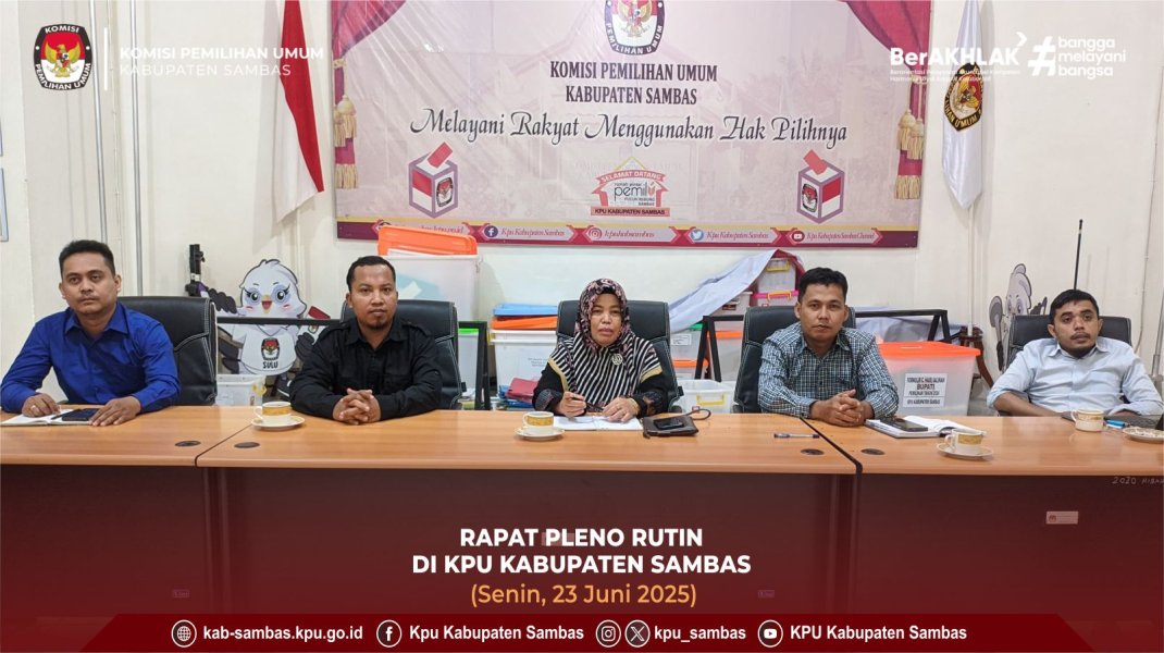 sambas.kpu.go.id - Sambas, KPU Kabupaten Sambas melaksanakan Rapat Pleno Rutin di ruang rapat kantor KPU Kabupaten Sambas, Selasa (23/6/2025). Rapat dipimpin oleh Ketua dan dihadiri Anggota, Sekretaris, Kasubbag dan Staf Sekretariat KPU Kabupaten Sambas. Agenda rapat yaitu membahas Evaluasi Kegiatan 1 Minggu Sebelumnya, Rencana Kegiatan 1 Minggu Kedepan, Pembahasan Daftar Resiko KPU Kabupaten Sambas, Pembahasan Surat Ketua KPU Republik Indonesia Nomor : 1078/PP.06-SD/09/2025 tanggal 18 Juni 2025 Perihal Penghimpunan Barang Museum Nasional Perjalanan Pemilu, Progres Pengelolaan Website dan Media Sosial JDIH KPU Kabupaten Sambas, Rencana Pendistribusian Buku Hasil Riset Data Pemilih dan Sertifikat Badan Adhoc Pilkada Tahun 2024 dan Hal-hal lain yang dianggap perlu.