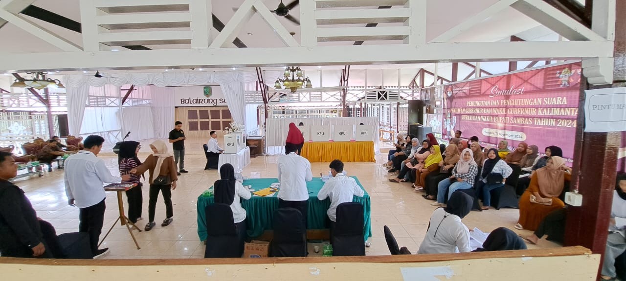 Upaya meningkatkan kualitas penyelenggara pemilihan kepala daera Tahun 2024, Komisi Pemilihan Umum Kabupaten Sambas melaksanakan simulasi pemungutan dan penghitungan suara di Tempat Pemungutan Suara. Kegiatan yang digelar, Minggu (17/11) kemarin, di Balairung Sari, Desa Lorong, Kecamatan Sambas.